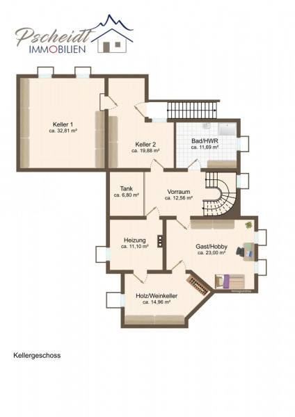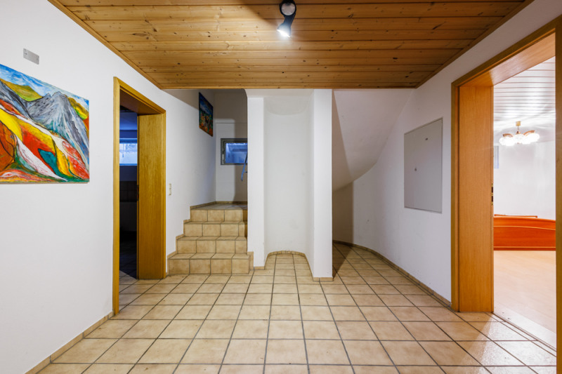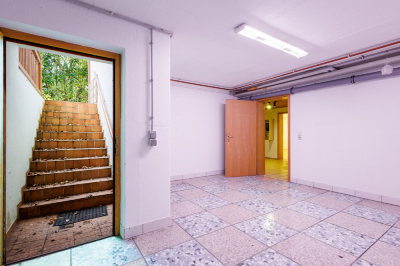 Der ausgebaute und beheizbare Keller bietet auf ca. 133 m² vielseitig nutzbare Räume, darunter Hobby- oder Gästebereich, Duschbad/Hauswirtschaftsraum, Kellerräume, Holzlager-/Weinkeller sowie Heizungs- und Technikraum mit Lagerplatz für Öltanks. Zudem führt ein Treppenaufgang direkt in den rückseitigen Garten.