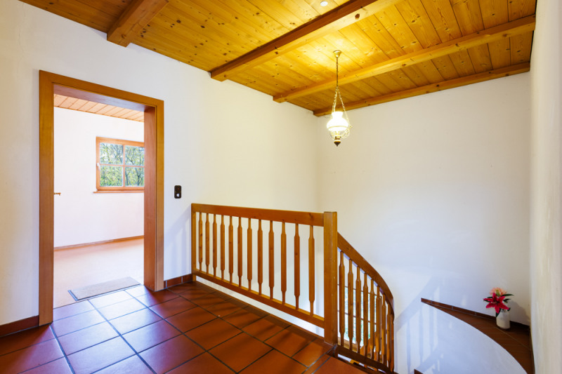 Hochwertige Fliesenböden im Wohnbereich, in Diele, Treppe, Bädern, WC und Keller sorgen für Pflegeleichtigkeit, während Holzdielen und Kork in den Schlafräumen Wärme und Wohnlichkeit vermitteln.
