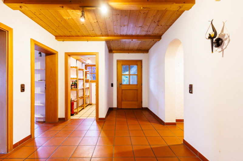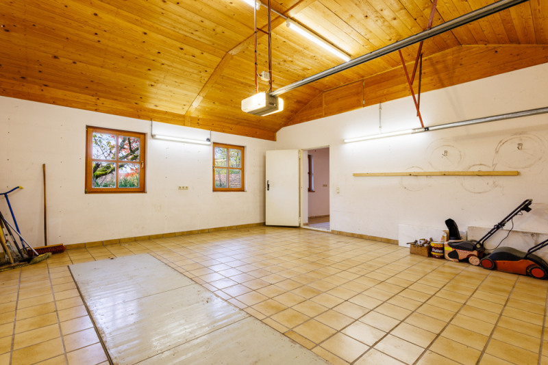 Doppelt verglaste Fenster, manuelle Außenjalousien und ein durchgehender Dachüberstand, der Terrasse und Balkon harmonisch überdeckt, unterstützen das angenehme Wohnklima. Zusätzlich sorgt die Fußbodenheizung für ein komfortables und behagliches Wohngefühl. Der liebevoll eingewachsene Garten mit Sträucher- und Baumbestand umrahmt das Haus und lädt zu entspannten Stunden im Freien ein. Ein Wasseranschluss auf der Terrasse sorgt für praktische Nutzbarkeit im Gartenalltag. Die große Doppelgarage mit elektrischem Tor bietet nicht nur Platz für zwei Fahrzeuge, sondern auch einen direkten Zugang ins Haus – ein komfortabler Vorteil zu jeder Jahreszeit.